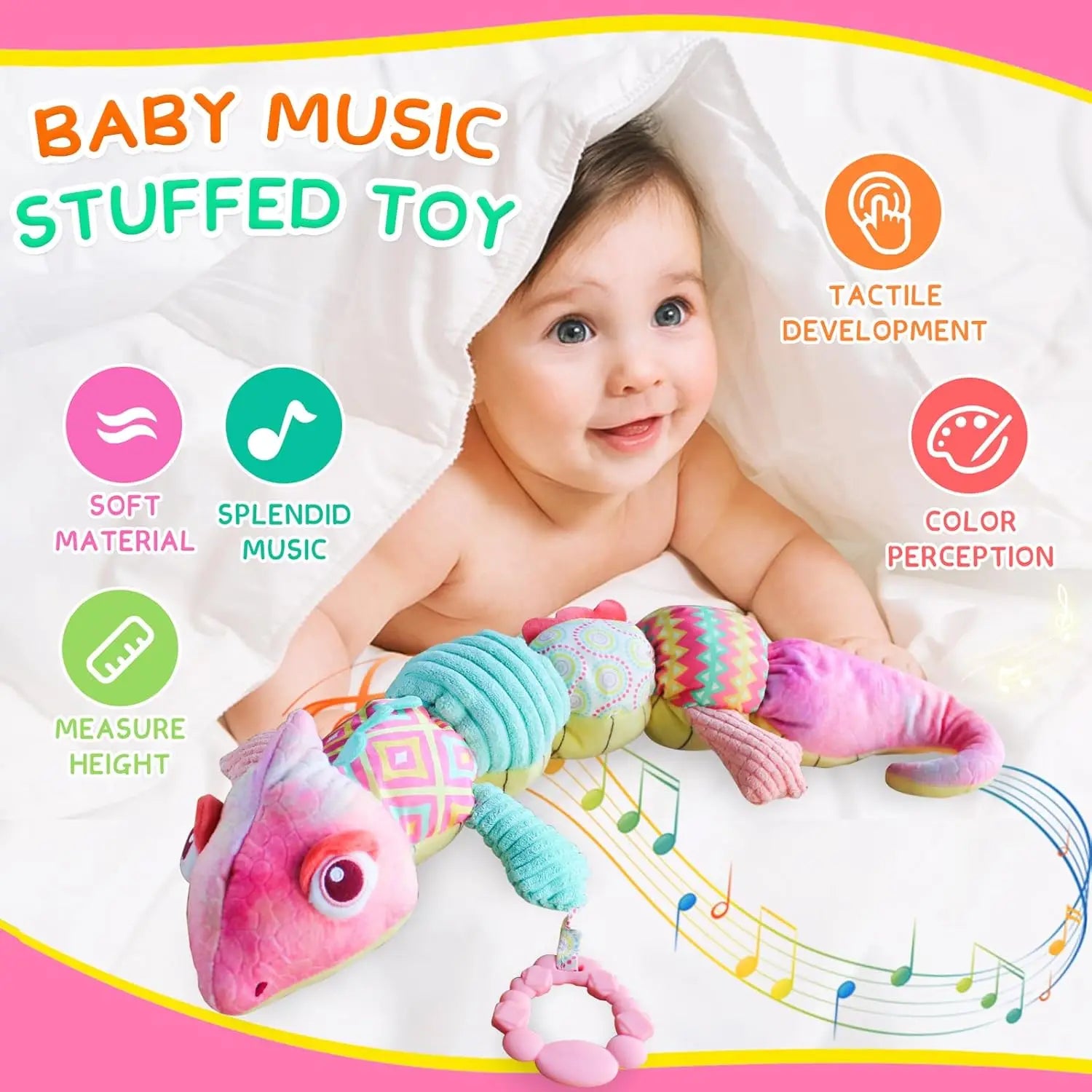 1.4 IN 2 Baby Activity Toys - Combines the fun of early learning pattern toys, Musical toys, Rattle toys, Animal plush toys into this toy. Providing an all-around sensory experience for babies on a lizard toy.