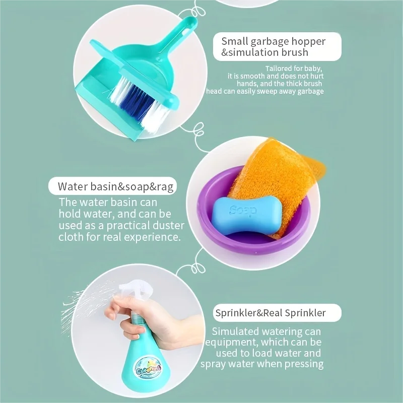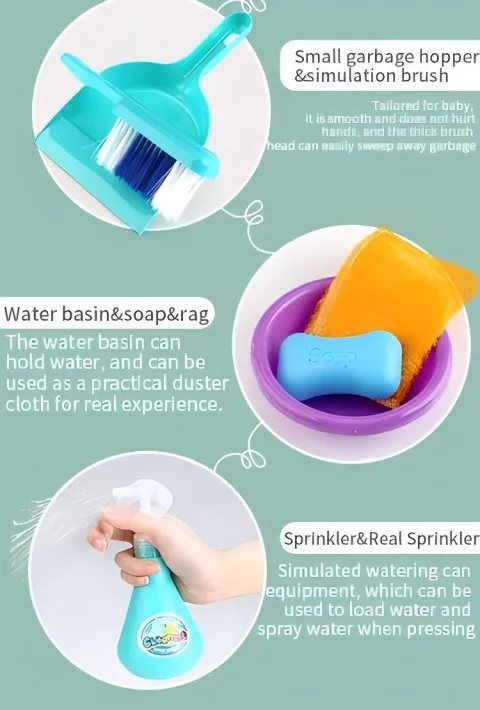 【Learning and Playing】The children's cleaning set will actively help children maintain good personal hygiene and develop good organizational habits. Inspire children's sense of responsibility, enhance their self-confidence, and can also improve their motor skills and patience. It is also an ideal practical tool for the classroom.